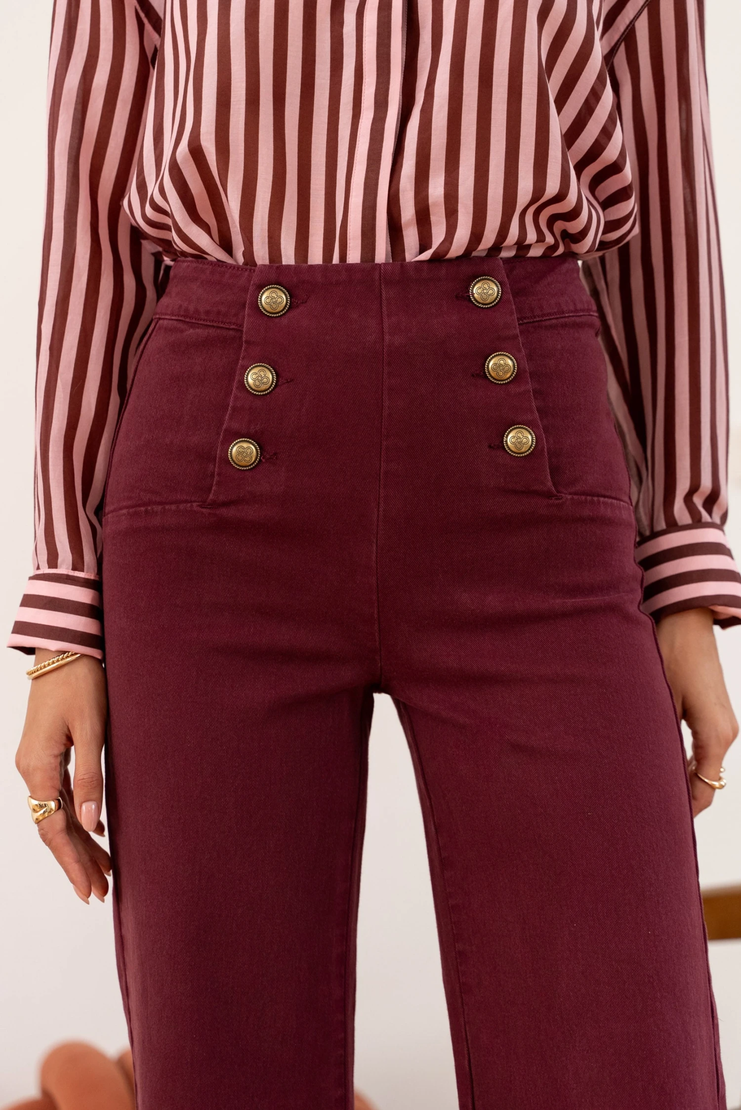 Le jean Victorine a été conçu avec des détails précis qui le rendent unique : ses boutons à pont. C’est en ce détail que réside l’élégance et l’originalité de ce jean. En effet le positionnement de ceux-ci en légère diagonale permet d’affiner la taille, de plus si vous y regardez de plus près ses boutons sont d’inspiration « marine » ils ont un look très singulier et reconnaissable.